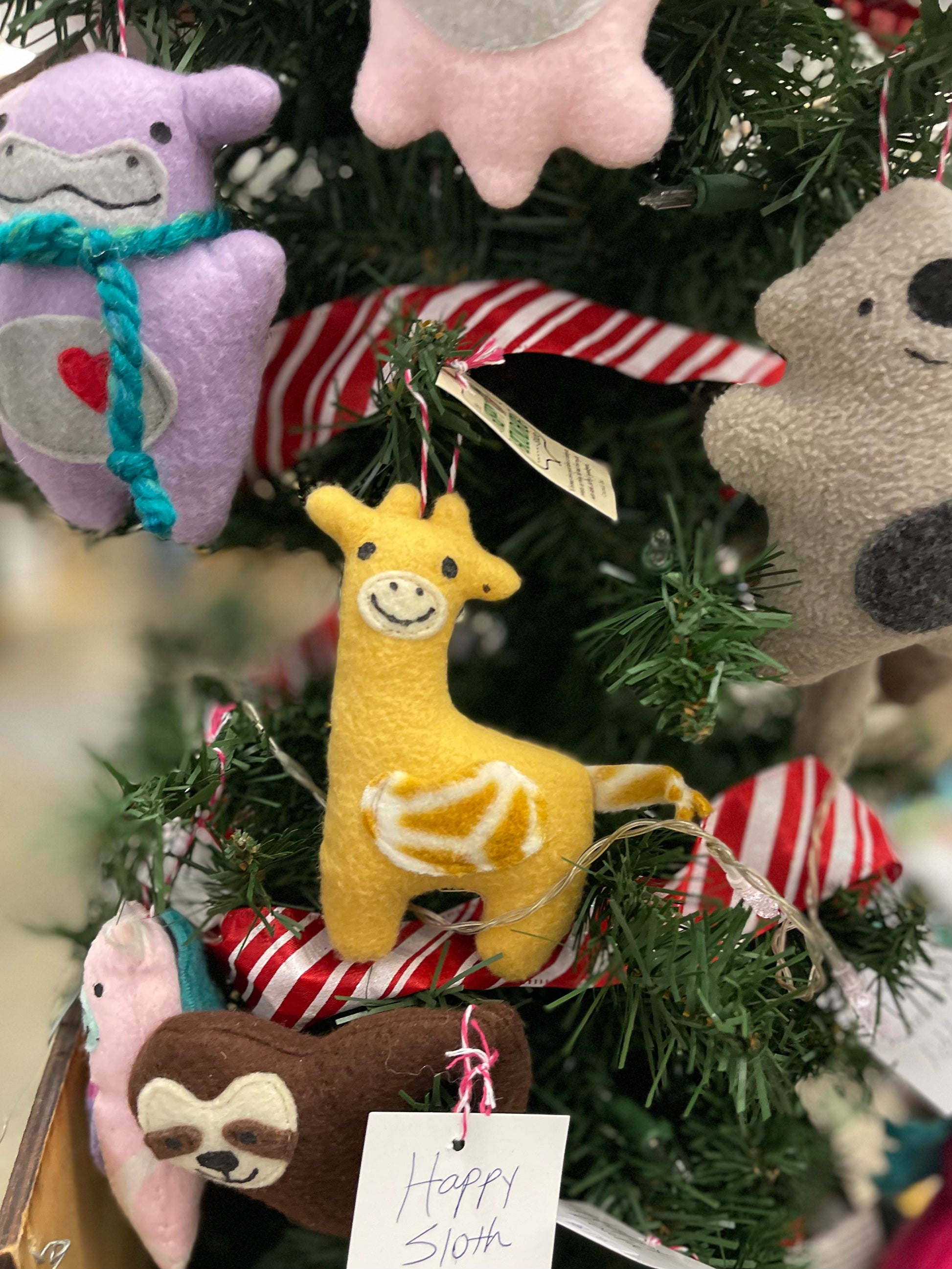 This little Happy Giraffe is ornament sized at approximately 5” tall and 4” wide. Like all our critters, the Happy Giraffe has a sweet little red heart sewn on the belly pocket for that extra touch of love. This little guy comes ready to hang. This ornament also fits in the pocket of the 12” Giraffe as shown but sold separately
