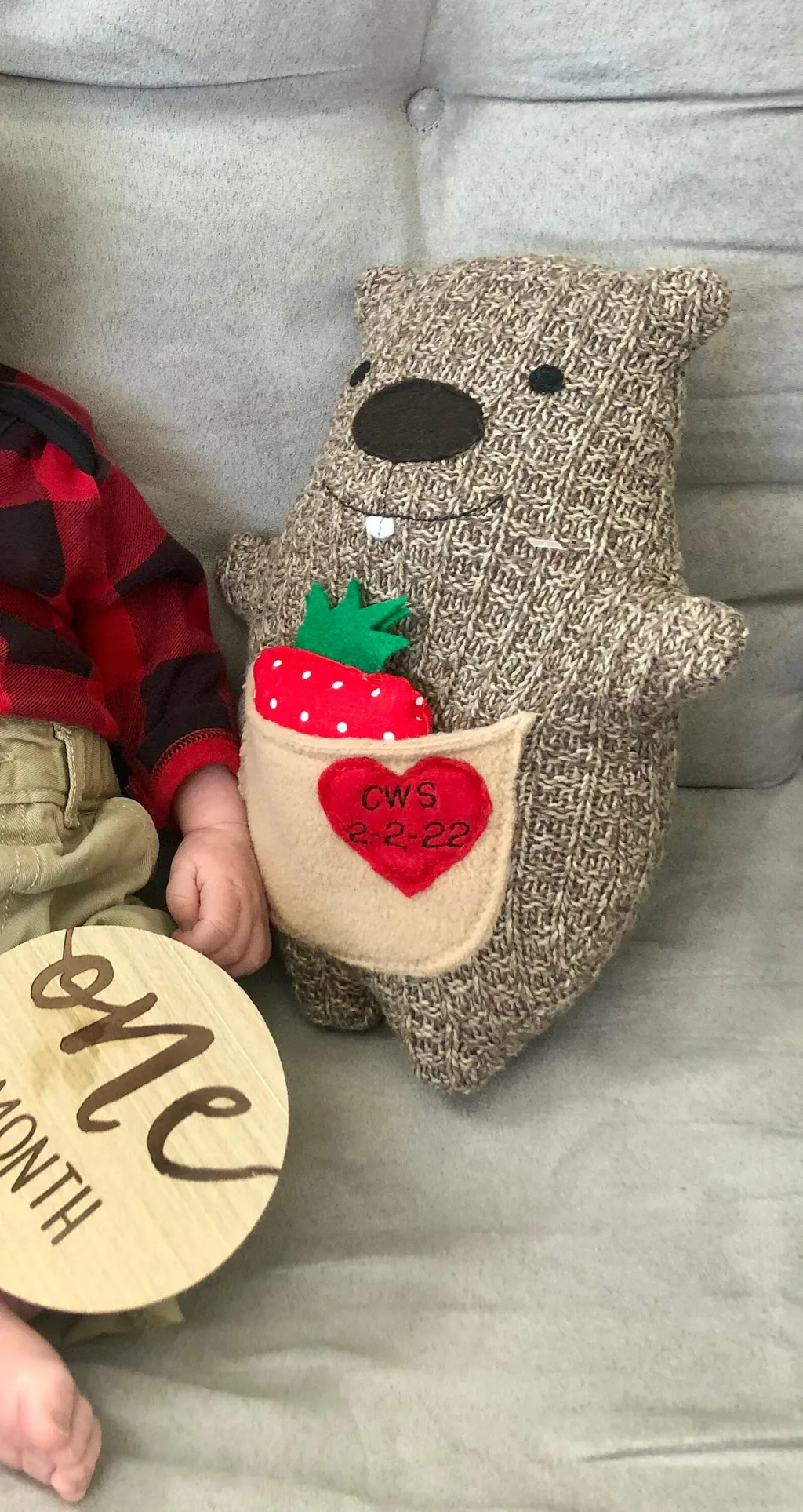 The Happy Groundhog is approximately 12" in length and about 6" wide. Like all our critters he has a sweet little red heart sewn on his belly pocket for that extra touch of love. You can add a special treat, like the strawberry shown, a note or gift card.
