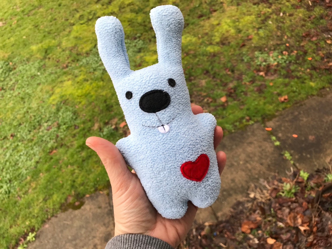 The Happy Bunnies are approximately 5” wide and 7” tall. Like all our critters, this cutie has a sweet little red heart sewn on his belly pocket for that extra touch of love.