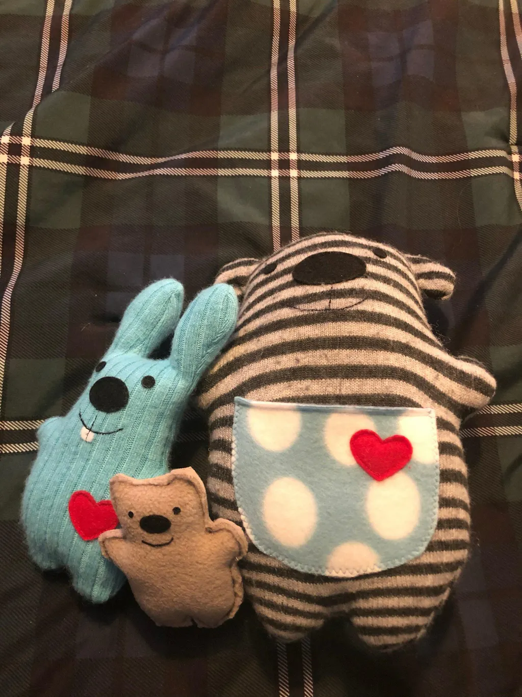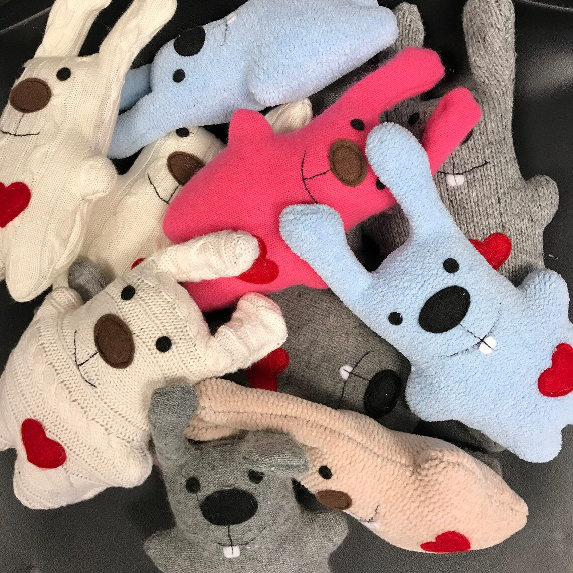 Since this is a hand-made item and made from recycled sweaters your Happy Critter will vary slightly from the one pictured as they are made to order from the selection of sweaters available. Please contact us if you would like to see the fabric before you order.