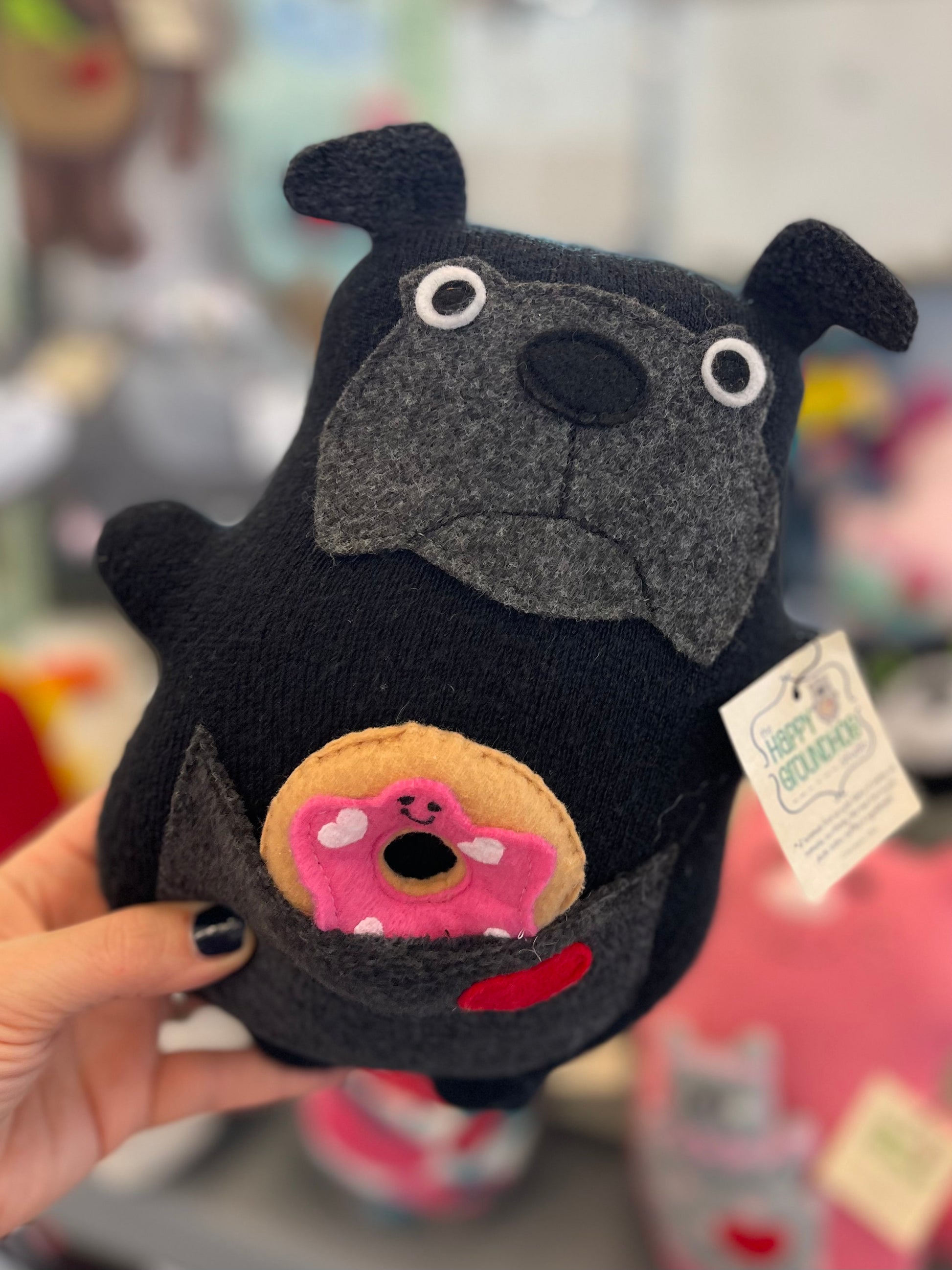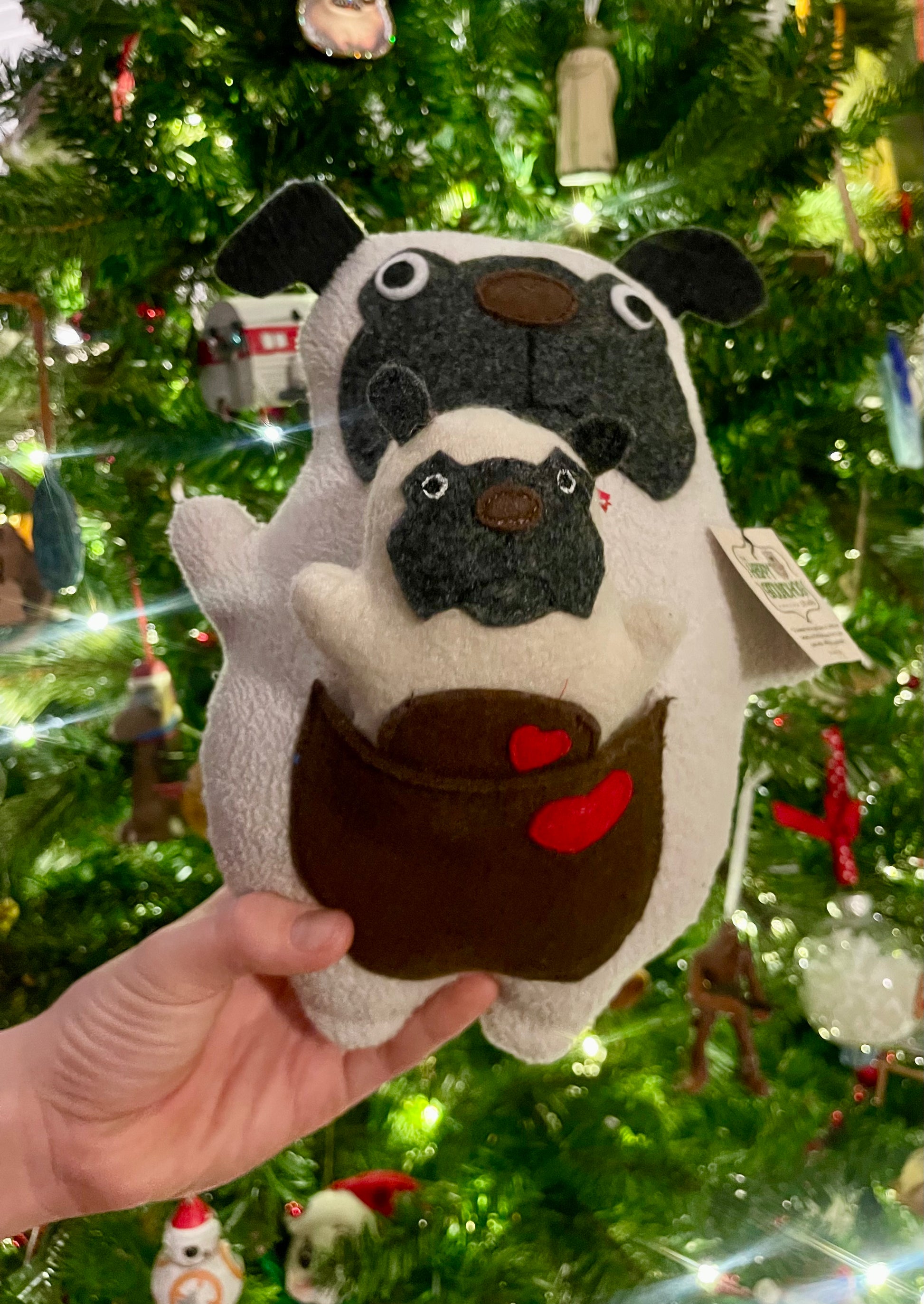 Standing at approximately 11" in length and about 8" wide, the Happy Pug, has a sweet little red heart sewn on his belly pocket for that extra touch of love. You can add a special treat, like the doughnut shown, a note or gift card.