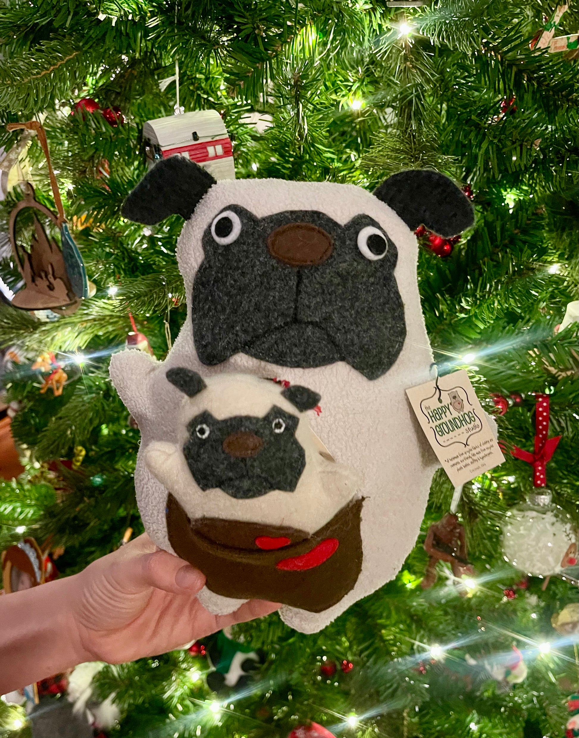 The Happy Pug is an heirloom quality gift and is handmade and crafted from reclaimed sweaters with details made from eco-fi felt. Eco fi felt is made from recycled plastic bottles and the stuffing is hypoallergenic. The Happy Pug is a Happy Groundhog Studio original design.
