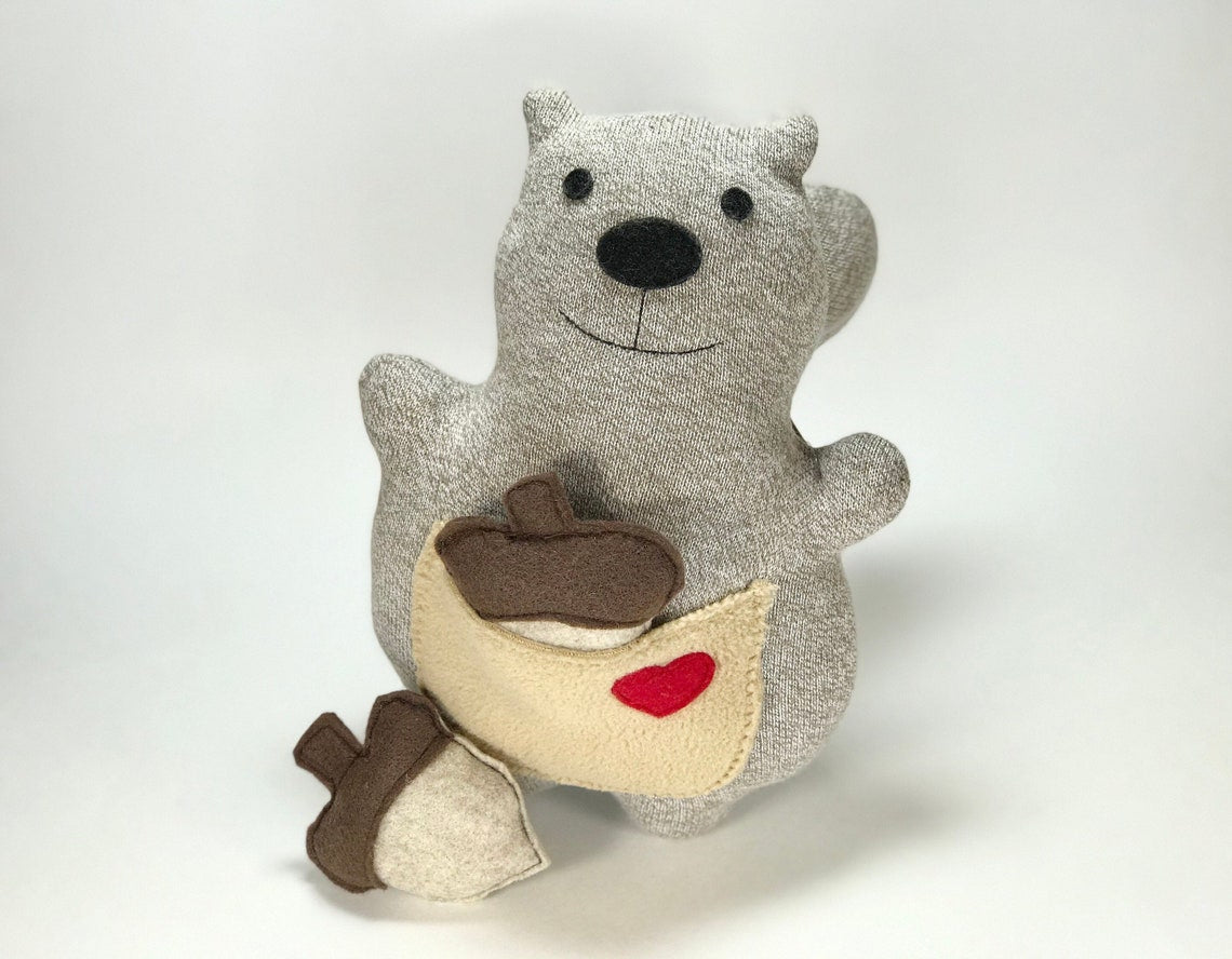 Standing at approximately 12" in length and about 8" wide, the Happy Squirrel has a sweet little red heart sewn on the belly pocket for that extra touch of love. You can add a special treat, like the nut shown, a note, or gift card.