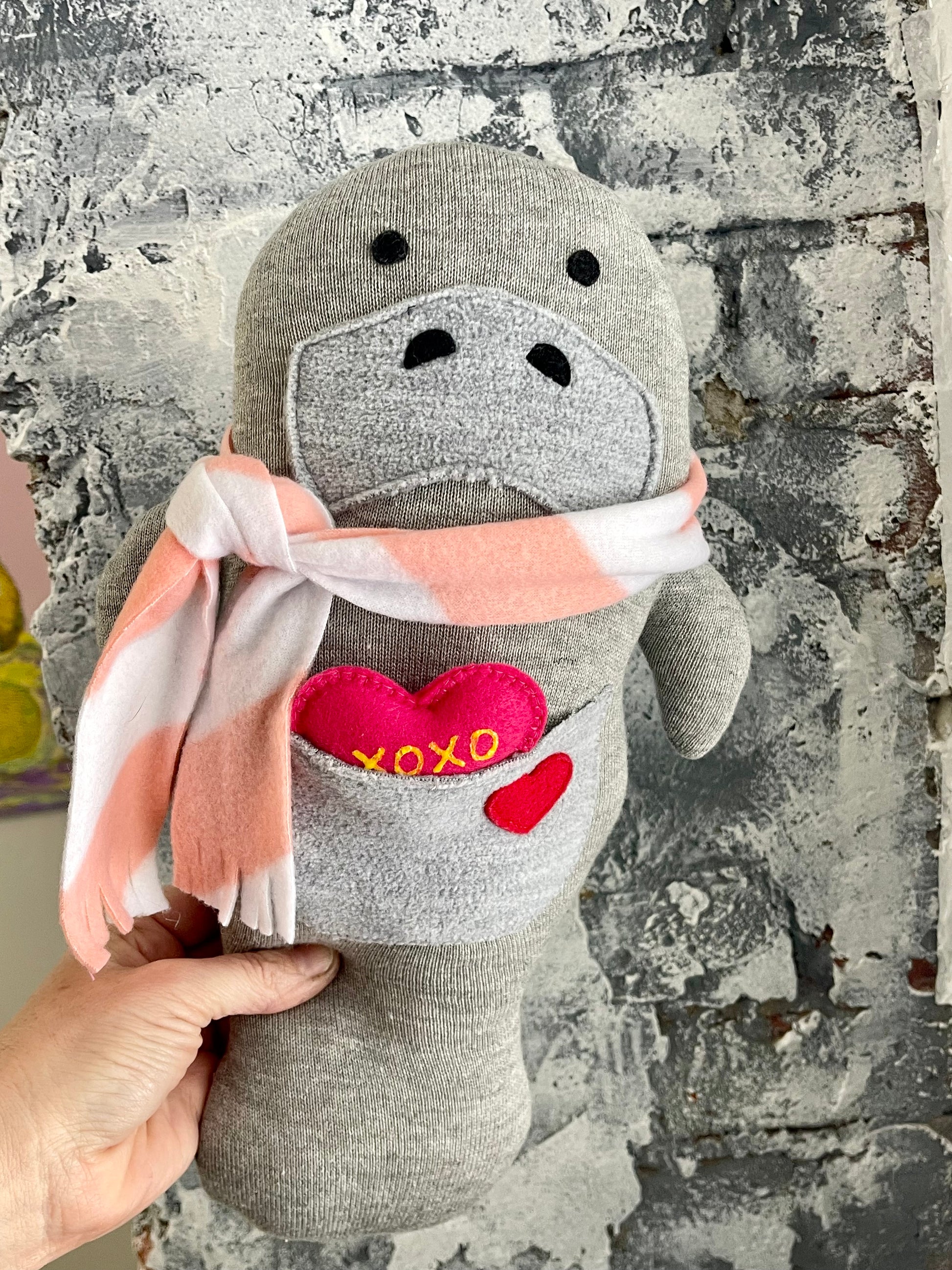 š©·Each Huggable Art friendĀ comes with a cute Valentineās Day themed scarf, each includes a Valentineās Day treat in their pocket, whether it be a ā¤ļøcookie or a conversation heart. The manatee, scarf and heart pictured are ready to ship!Ā